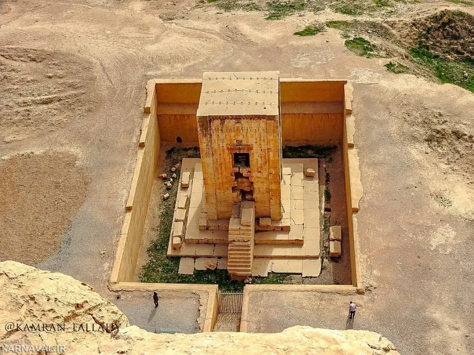 در این بنا میتوان کتیبهای از شاپور یکم را مشاهده نمود که این کتیبه یکی از مهمترین مأخذهای تاریخ ایران در سده سوم میلادی است. این نبشته سه ضلع از کرسی این بنا را دربرگرفته است که به زبانهای پهلوی، پارتی و یونانی نوشته شدهاند. در قسمت دیوار شرقی خطوط پهلوی به همراه سی و پنج سطر قابل مشاهده است و در قسمت غربی آن خطوط پارتی با سی سطر و در قسمت جنوبی خطوط یونانی به همرا هفتاد سطر نگاشته شدهاند و بیشترین آسیب وارد شده برای خطوط پهلوی است.